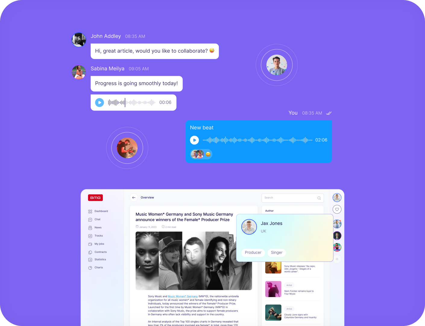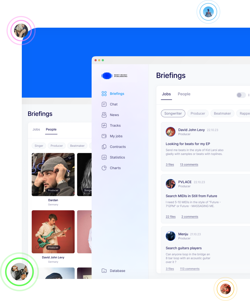 We save valuable time for your A&R teams and let them focus on the important tasks: creative decisions instead of administration. Files, pitches, briefings, feedback - all on one platform. Educate your roster with latest news and statistics, share valuable information quicker and more efficiently.